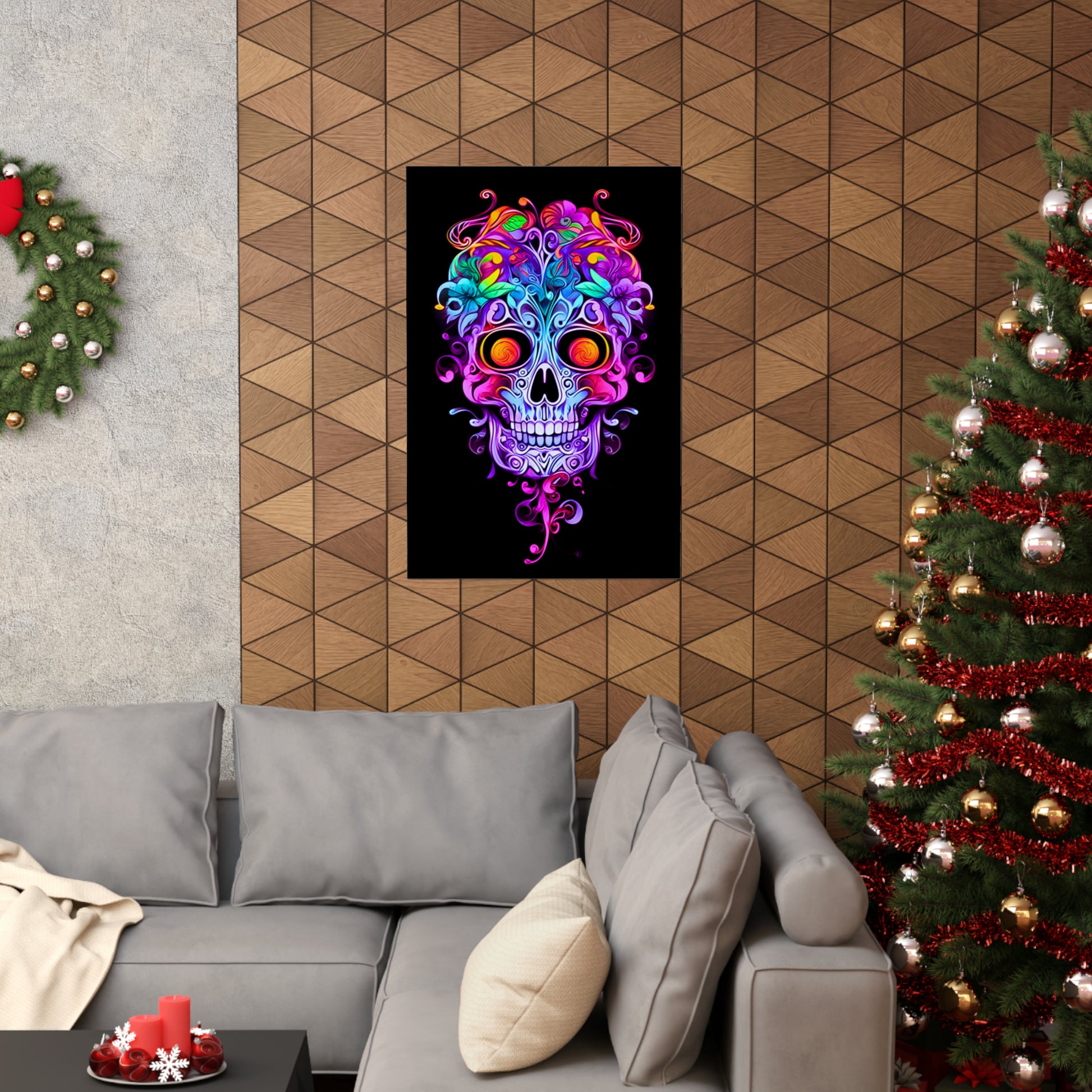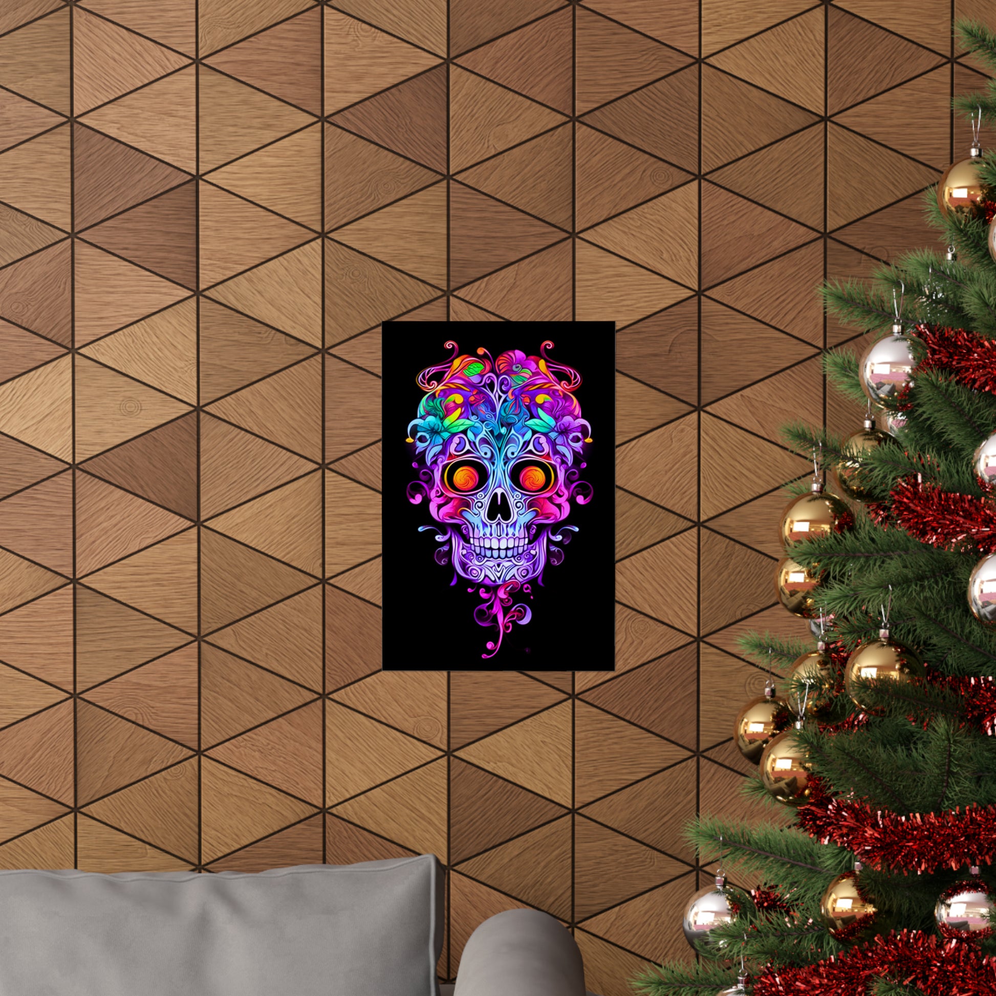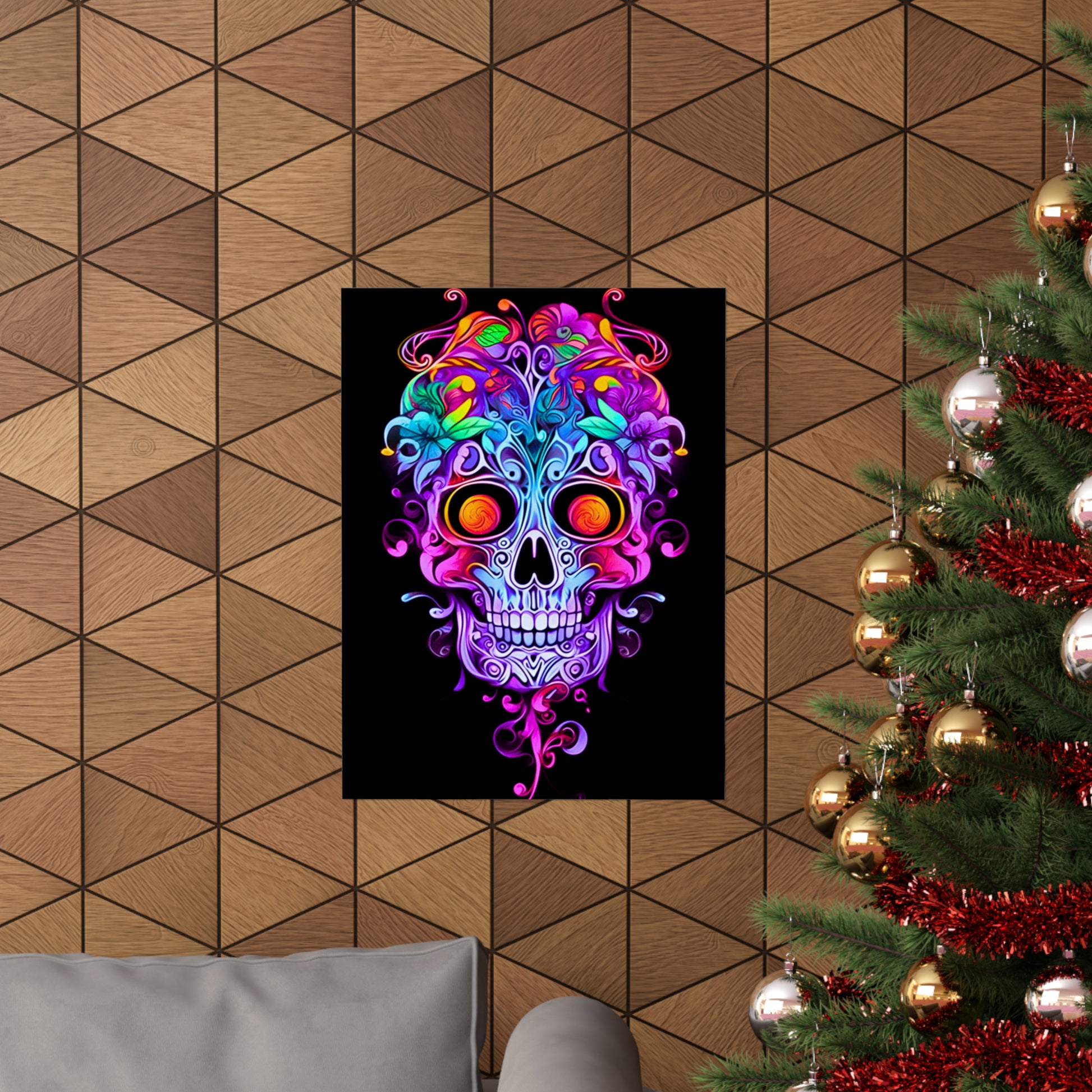 Immerse yourself in the enchanting world of Art Nouveau with our exquisite neon sugar skull. Adorned with intricate vines and ornate filigree, this captivating masterpiece combines the elegance of Art Nouveau with a vibrant neon twist. Discover the allure of this unique design that seamlessly blends tradition and modernity.