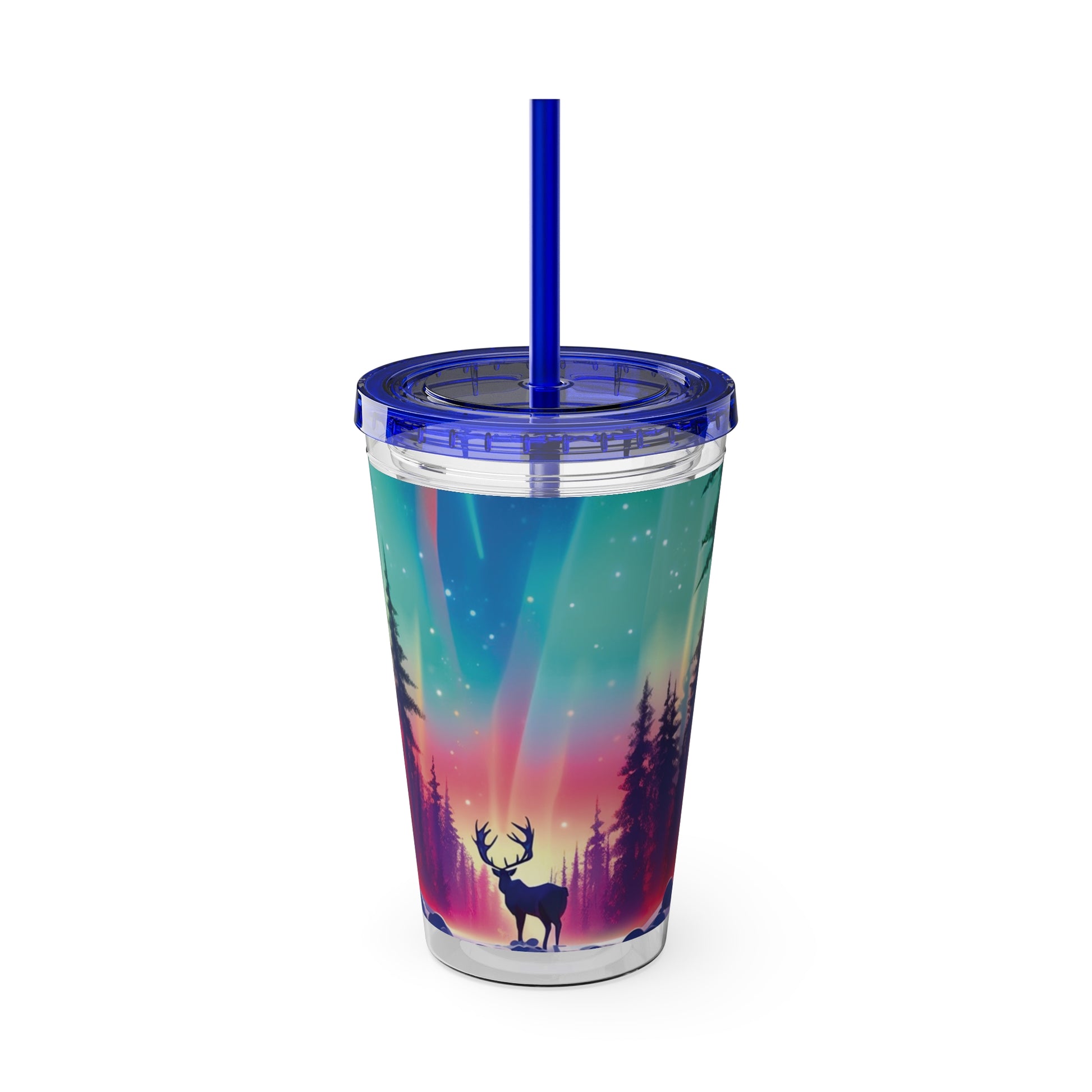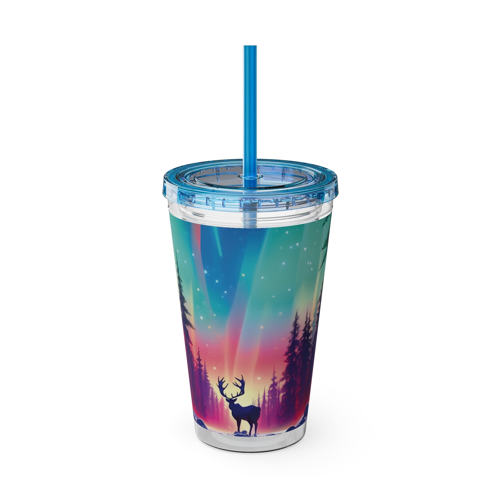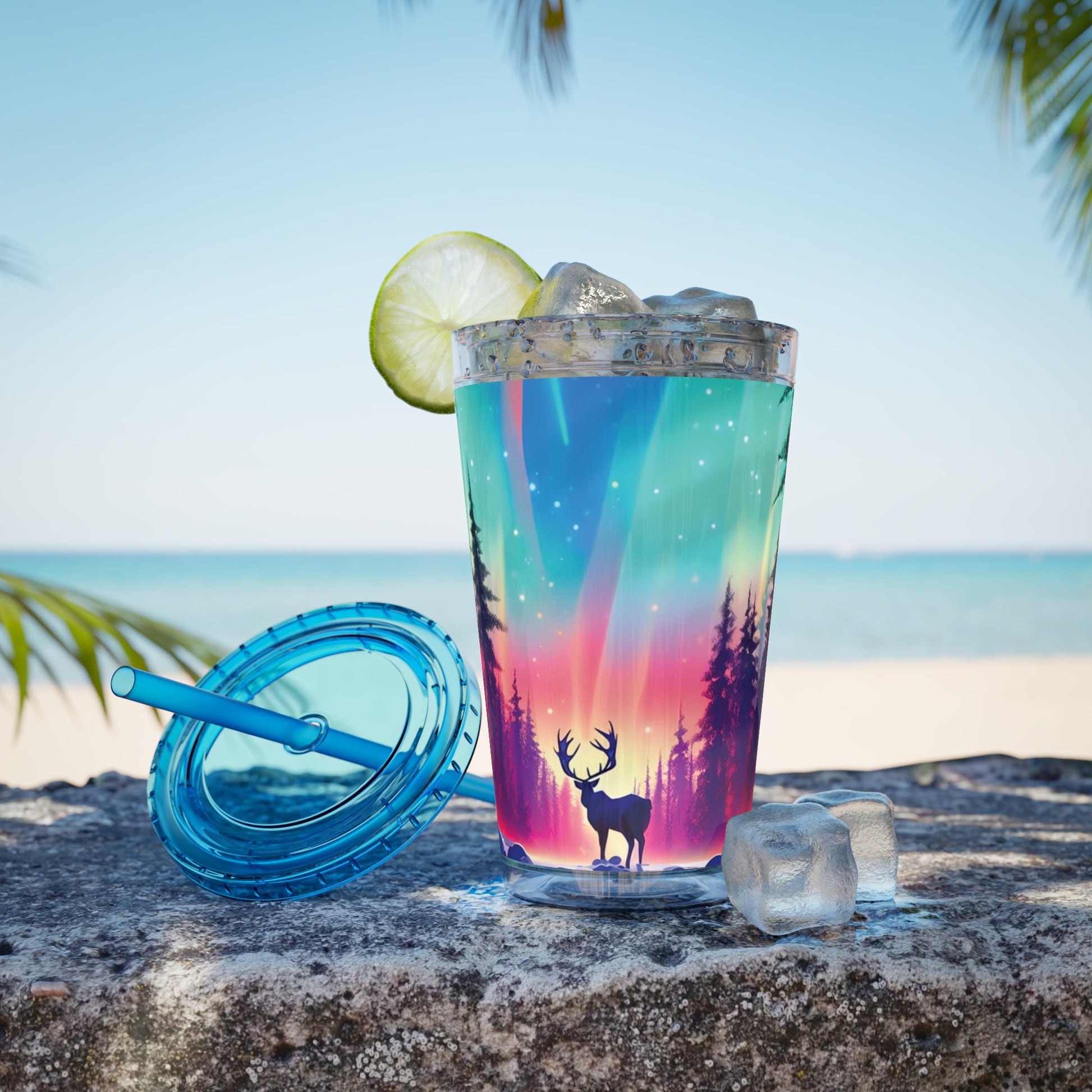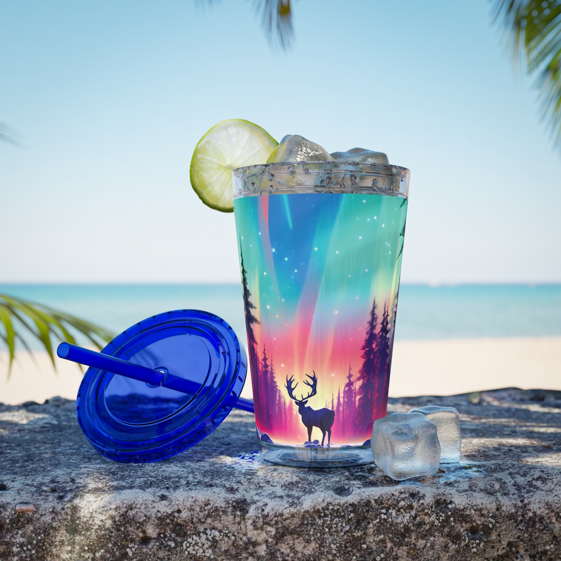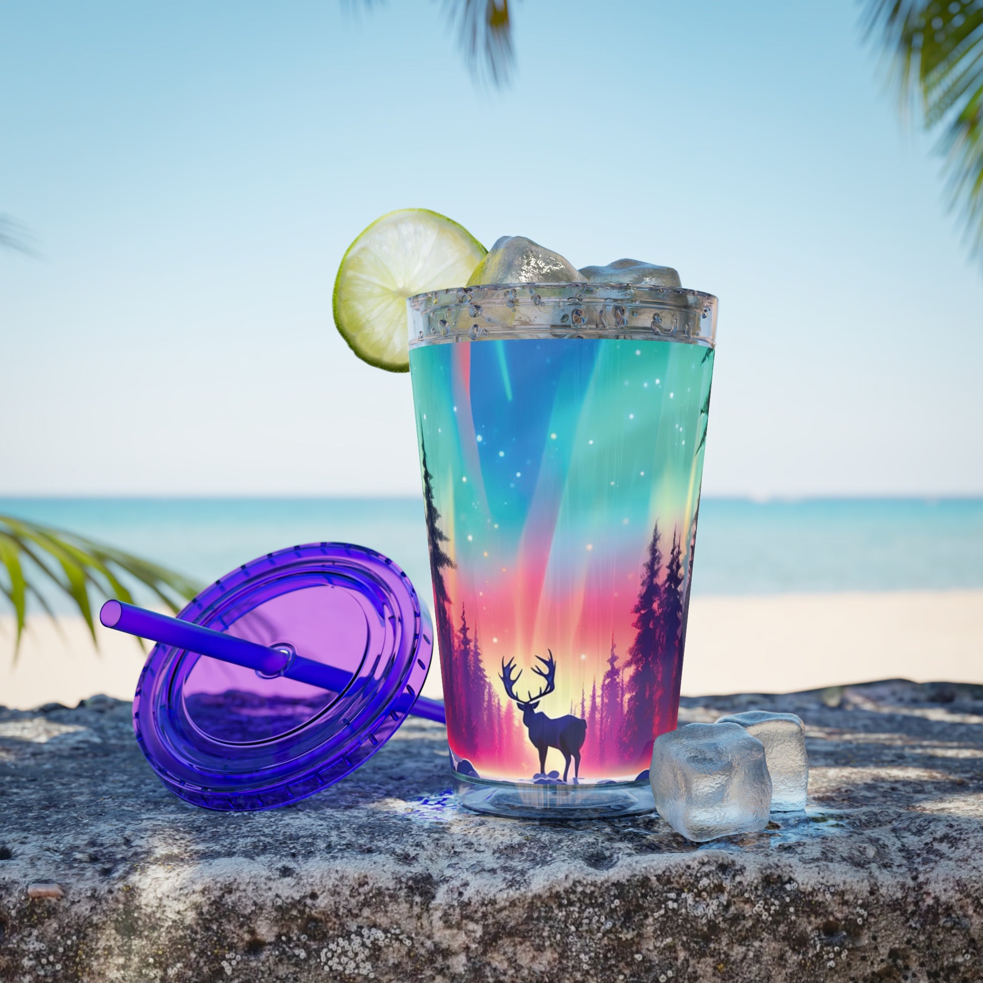 Experience the majesty of a tumbler cup adorned with a winter forest scene, where wandering reindeer bask in the spectacular Northern Lights show. Discover the beauty of nature and the Arctic night sky while you sip.