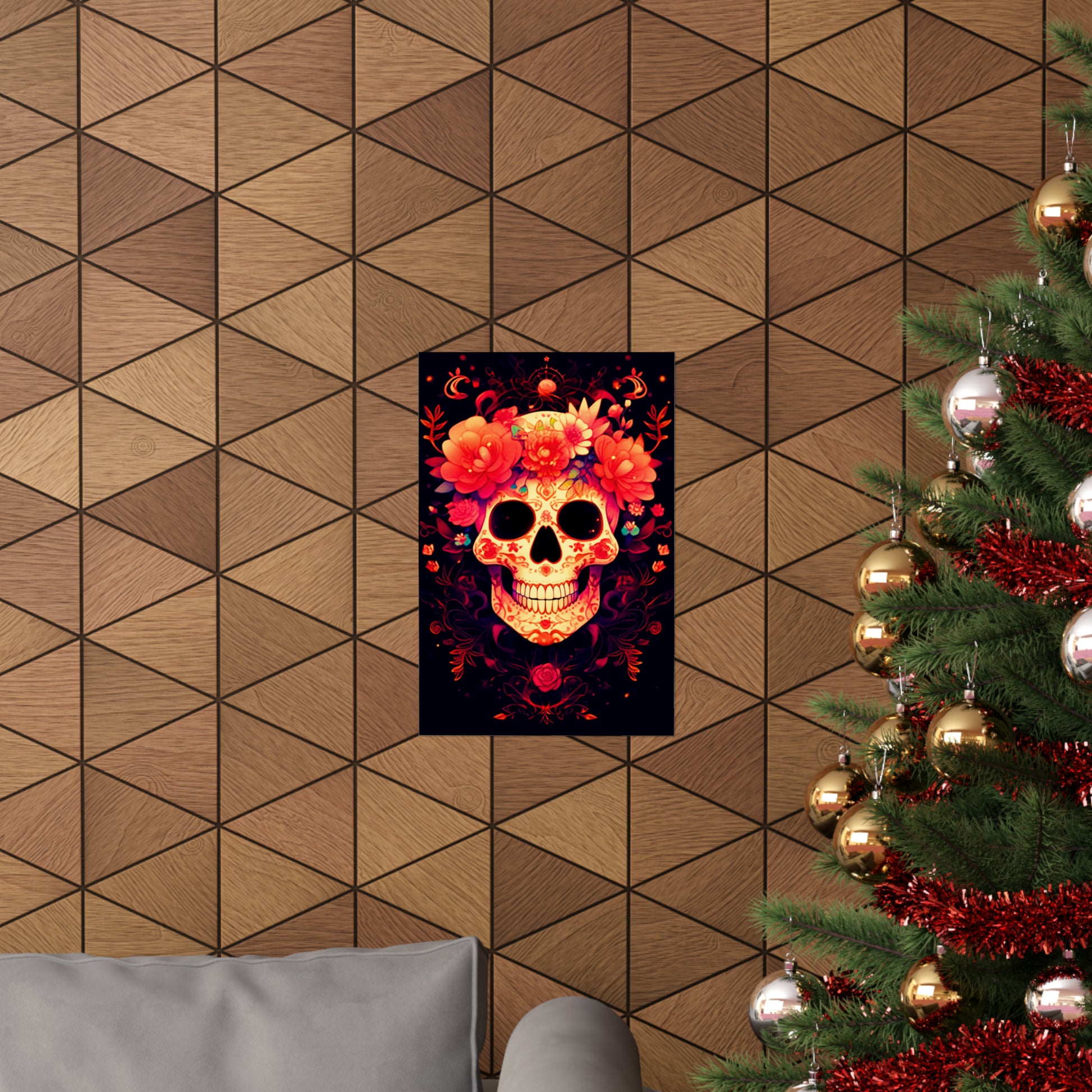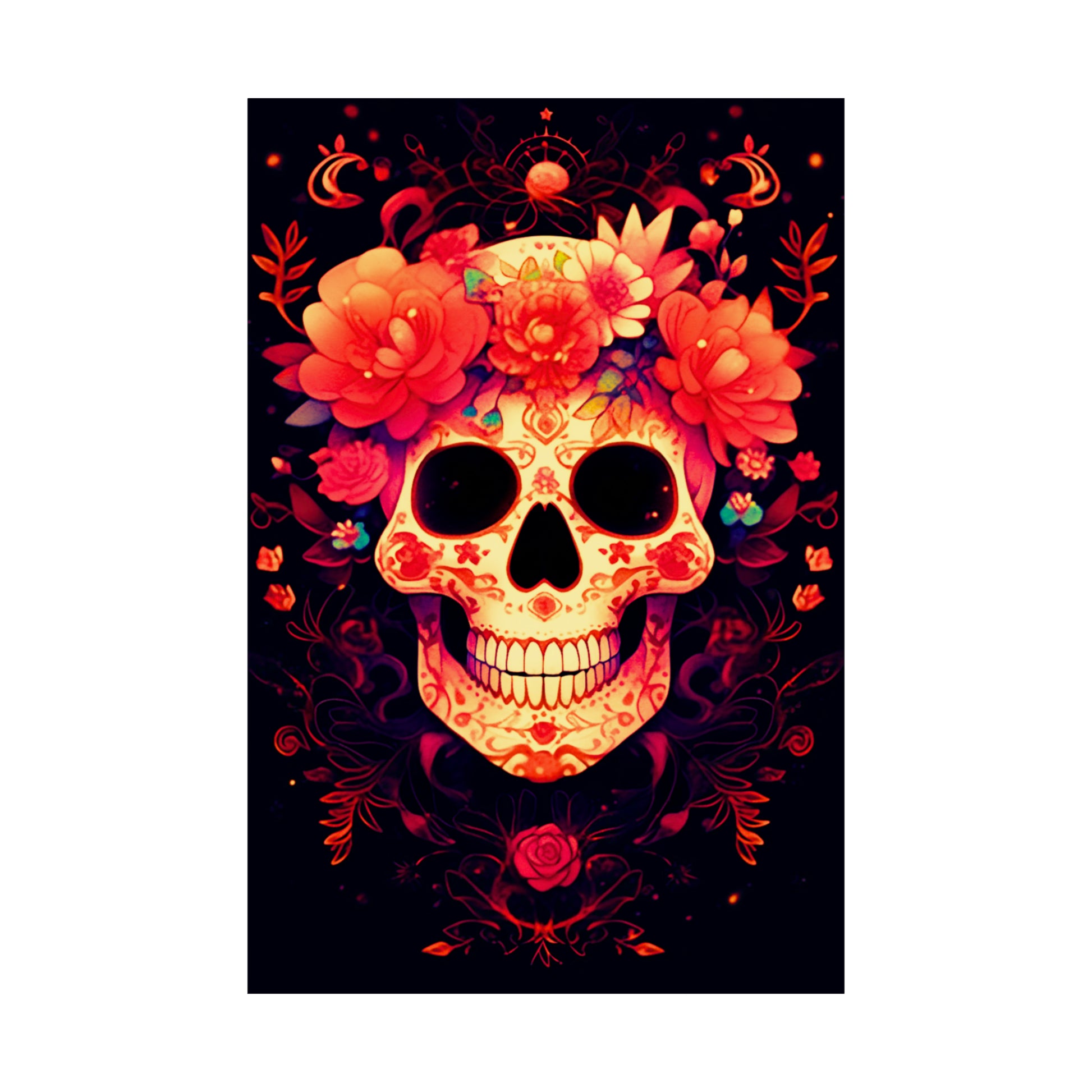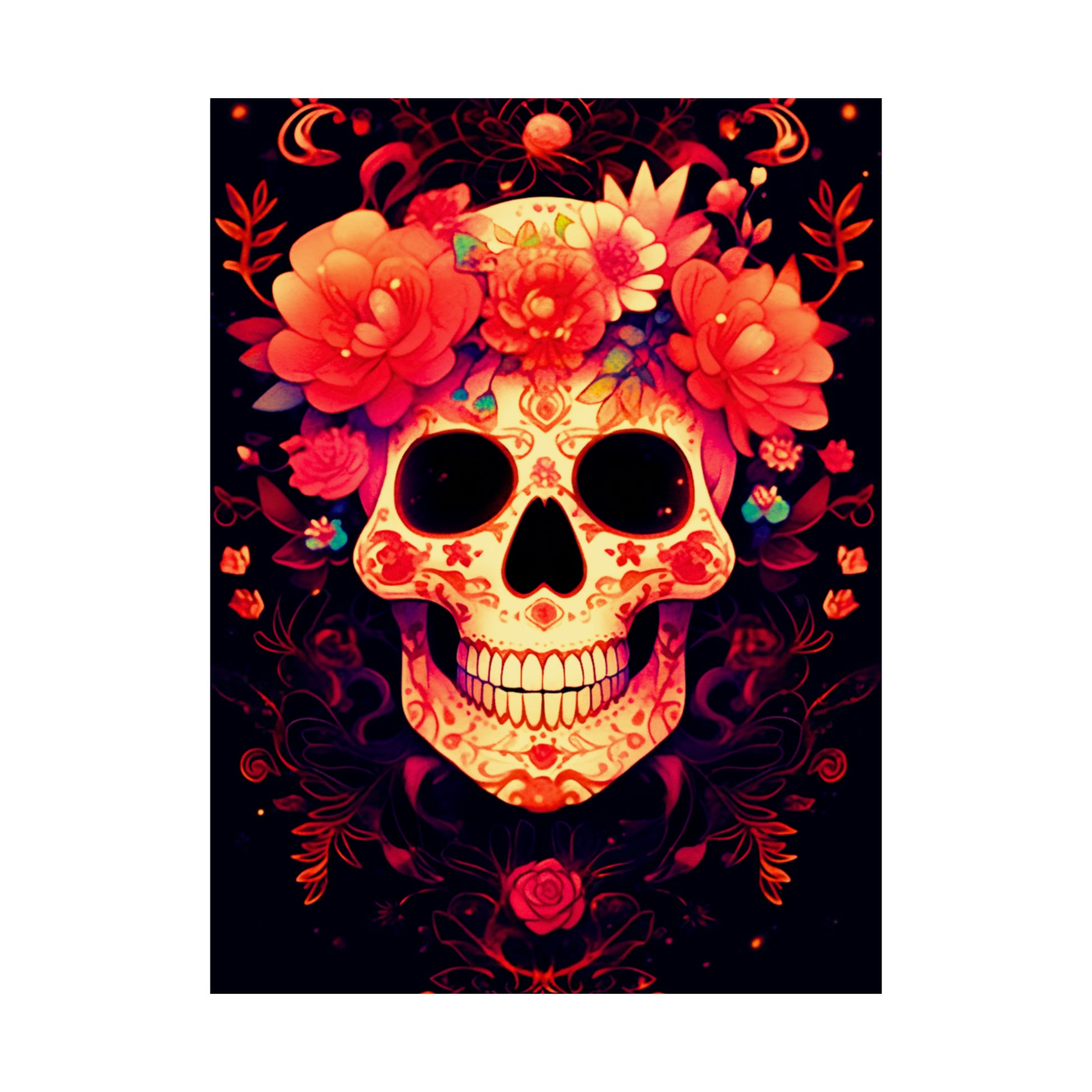 Discover an extraordinary sugar skull design adorned with vibrant marigold flowers, delicate lace patterns, and sparkling gemstones. Drawing inspiration from Mexican folk art, this richly colored masterpiece exudes an atmospheric feel with moody lighting and soft shadows. Immerse yourself in the artistry of this intricate sugar skull creation.
