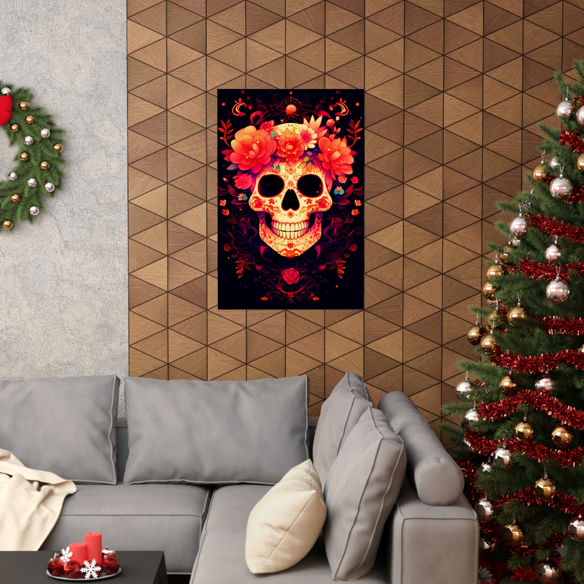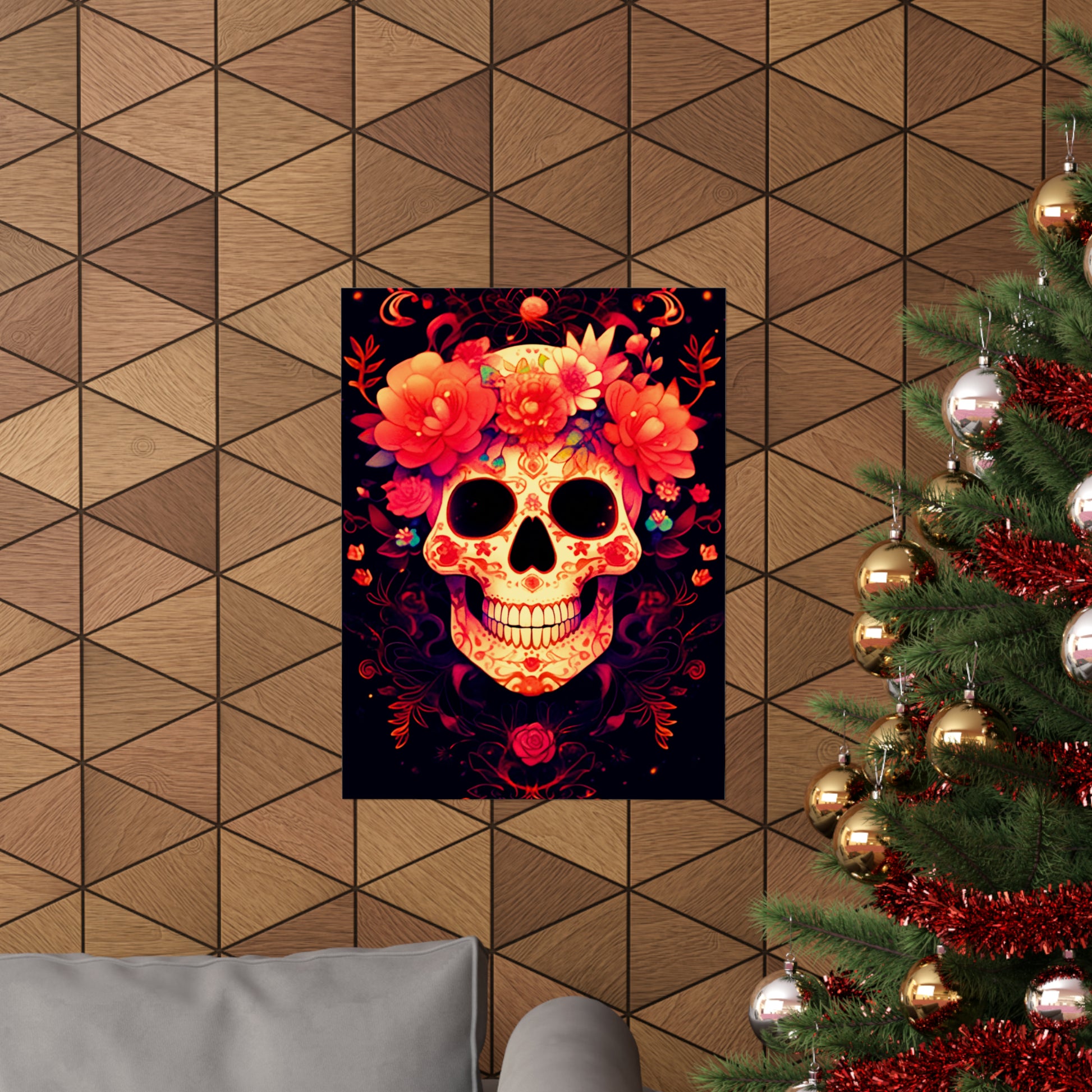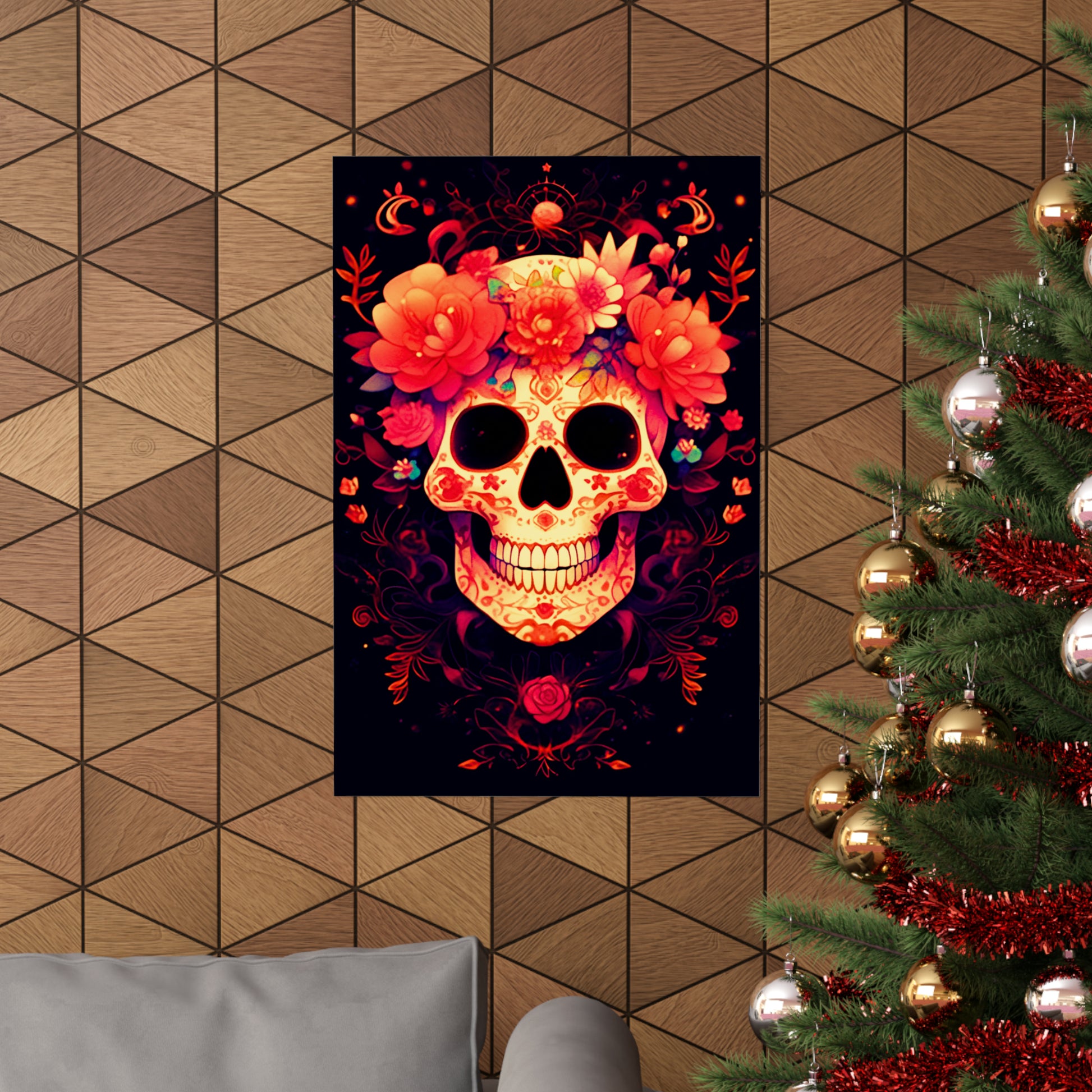Discover an extraordinary sugar skull design adorned with vibrant marigold flowers, delicate lace patterns, and sparkling gemstones. Drawing inspiration from Mexican folk art, this richly colored masterpiece exudes an atmospheric feel with moody lighting and soft shadows. Immerse yourself in the artistry of this intricate sugar skull creation.