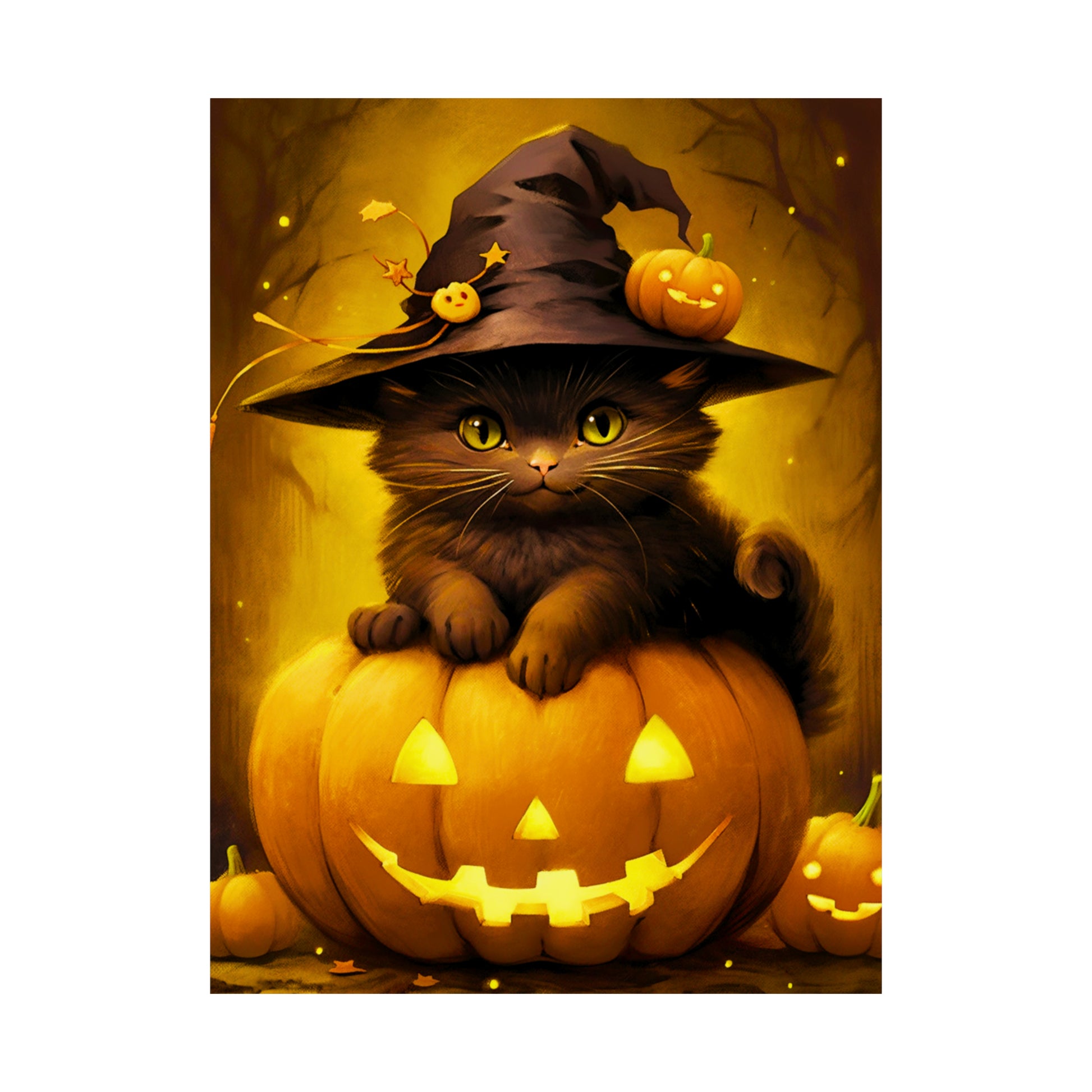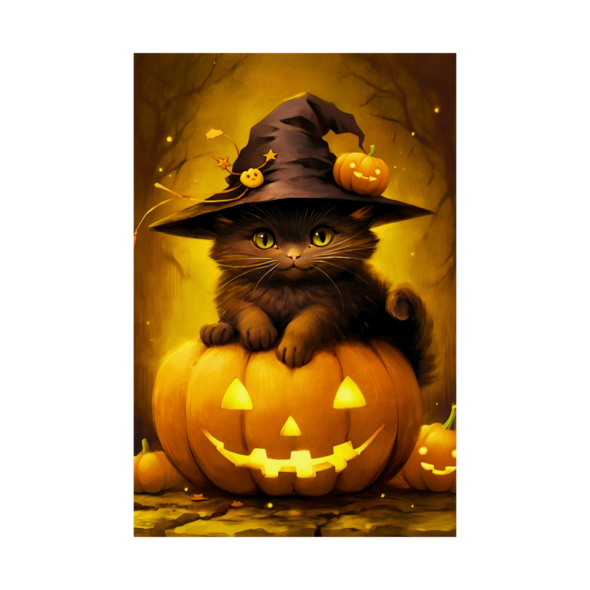Create a charming and playful atmosphere with our whimsical jack-o'-lantern featuring a mischievous cat wearing a witch's hat. The pumpkin's wide, toothy grin and the sparkling mischief in the cat's eyes will add a touch of enchantment to your Halloween decorations. Surrounded by fallen leaves and set against an autumnal backdrop, this jack-o'-lantern design evokes a cozy and playful ambiance. Perfect for Halloween enthusiasts seeking a delightful and whimsical addition to their festive decor.